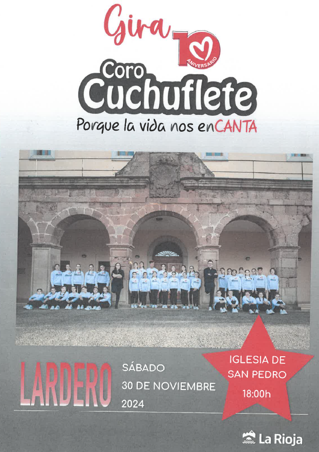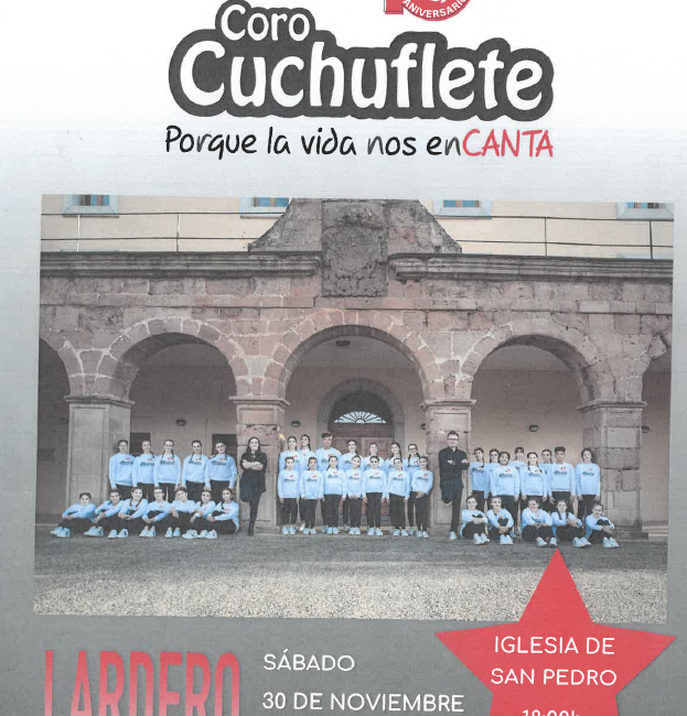 El sábado 30 de Noviembre de 2024 a las 18:00h el Coro Cuchuflete dará un concierto en la iglesia de San Pedro, con motivo de su gira 10 Aniversario.